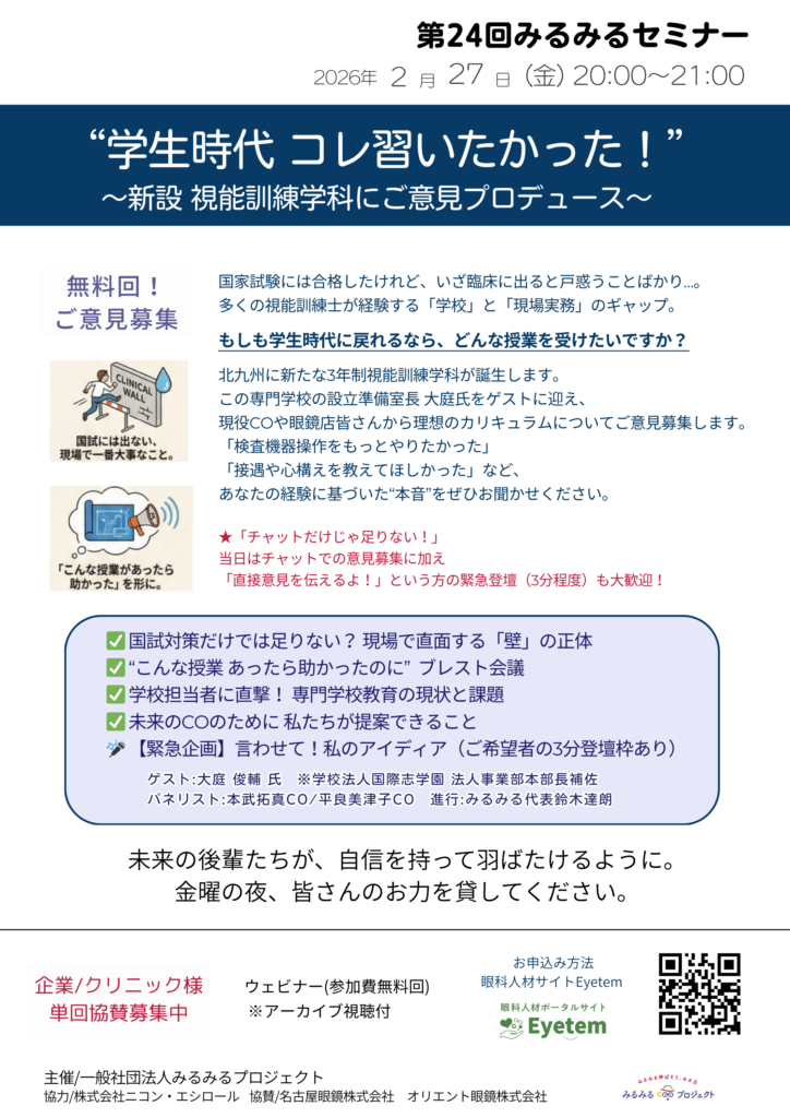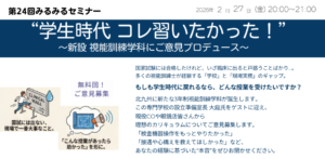 第22回みるみるセミナー2025.9.9(火)20:00~21:30 参加登録はこちら→https://23miru2s.peatix.com 協賛スポンサー募集セミナー運営維持のため協賛スポンサーを募集しております。( […] - 「四方よしの視能訓練士」